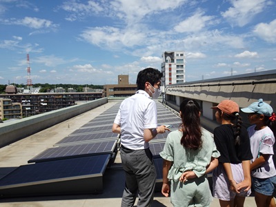 (高津区役所・ソーラーチーム) 高津区役所のエコな場所を探検します。 自然エネルギーを学び、晴れた日に太陽熱でゆで卵ができるソーラークッカーを作ります。